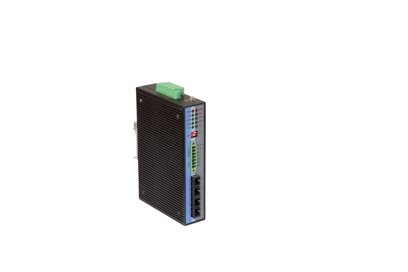 RS232/RS485/422 to dual fiber converter with 100 km redundant, fail-safe serial communication.