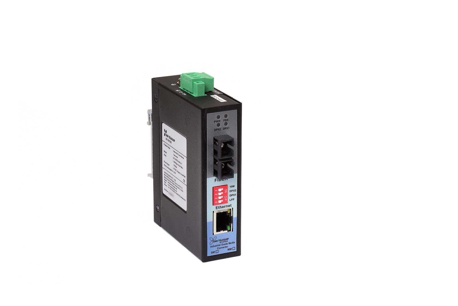 SAN Telequip’s Industrial Ethernet to Fiber Media Converters bridge copper and fiber optic networks, converting 10/100/1000Base-T(X) to 100/1000Base-X to extend data transmission distances up to 120km. These rugged units feature Link Fault Pass-Through (LFP) for network monitoring, IP40 fanless metal housing, and redundant 12-48V DC power inputs, maintaining reliable performance in extreme temperatures from -40°C to 85°C.